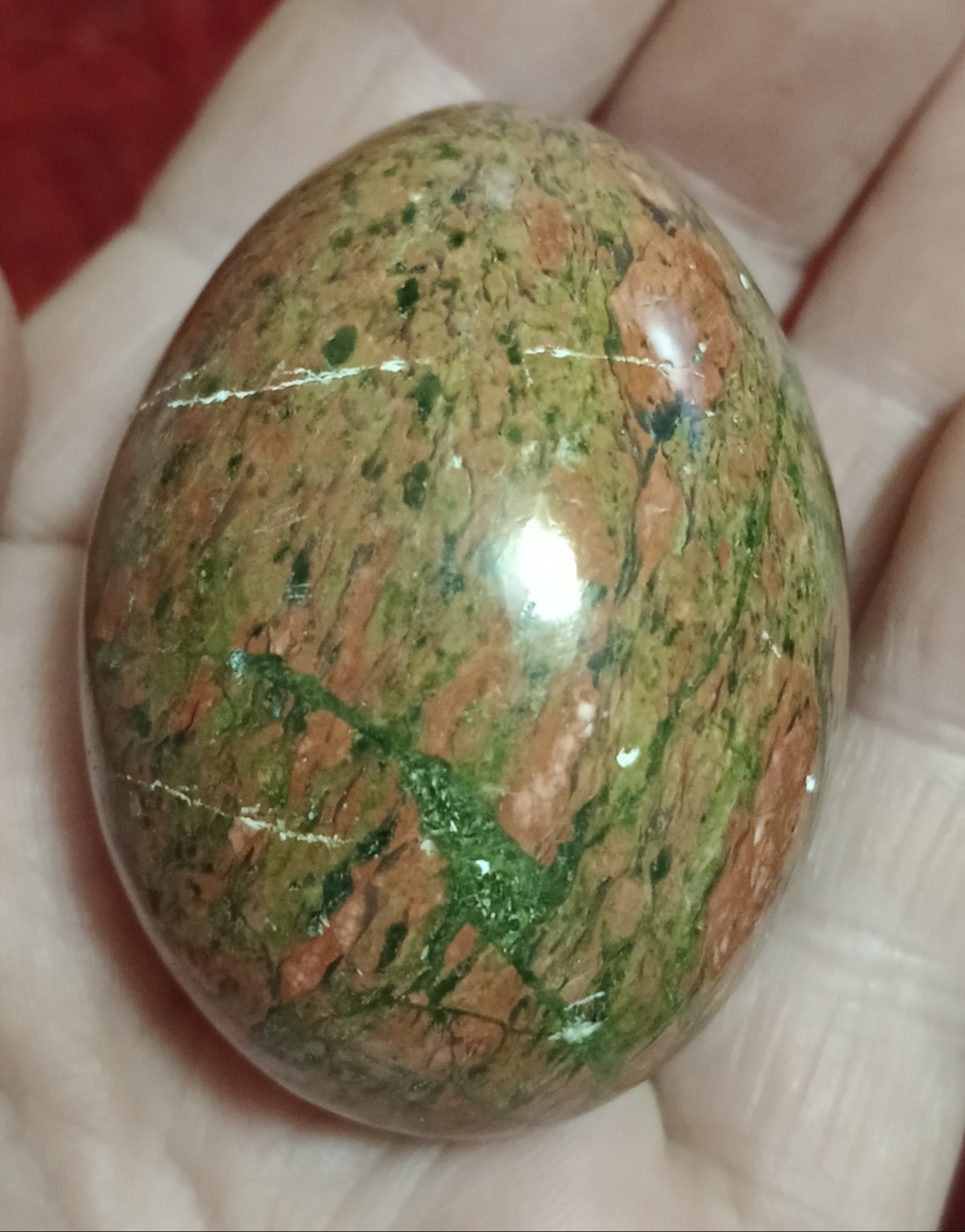 Striking Unakite egg, with white quartz band and gorgeous polish.
