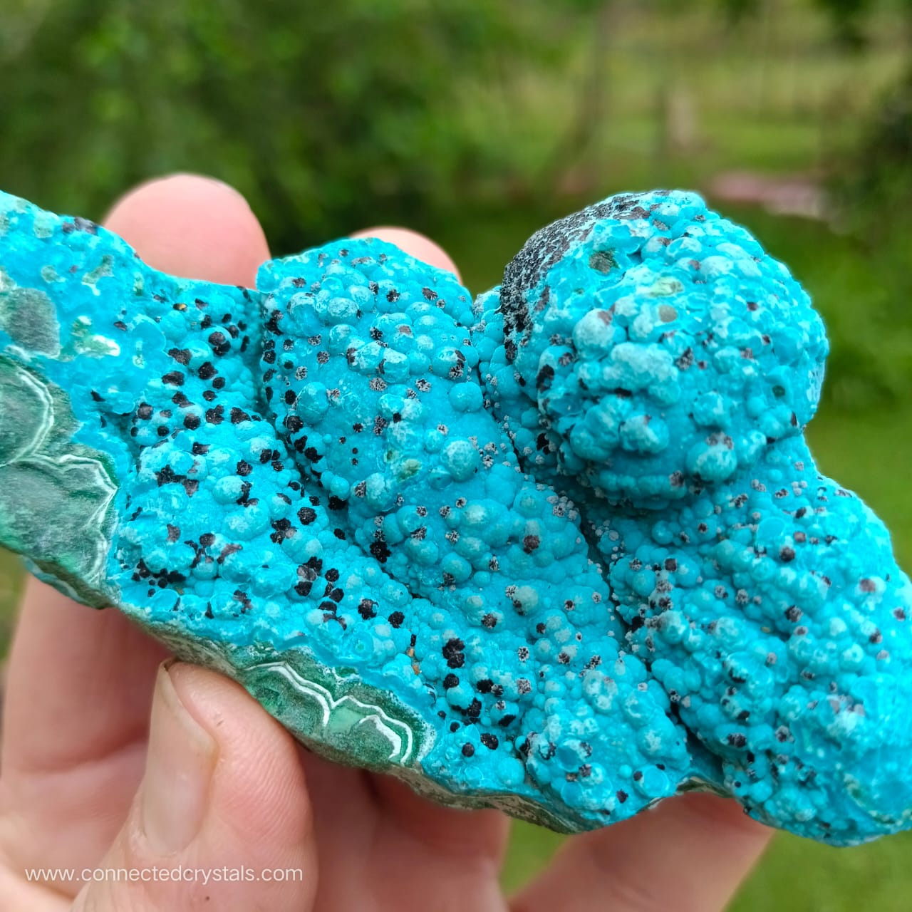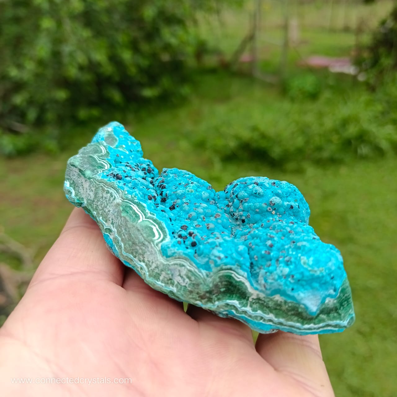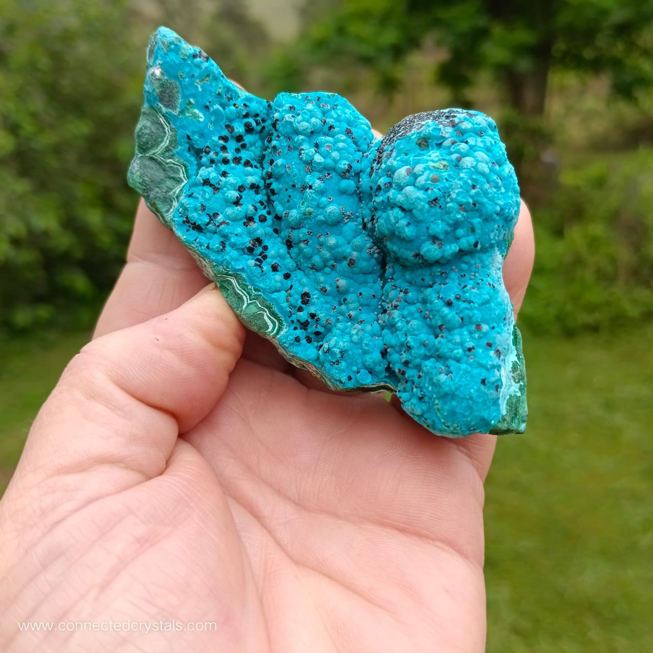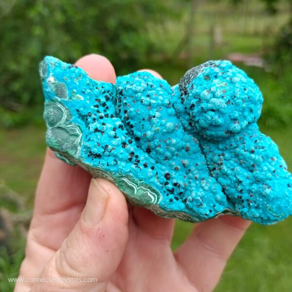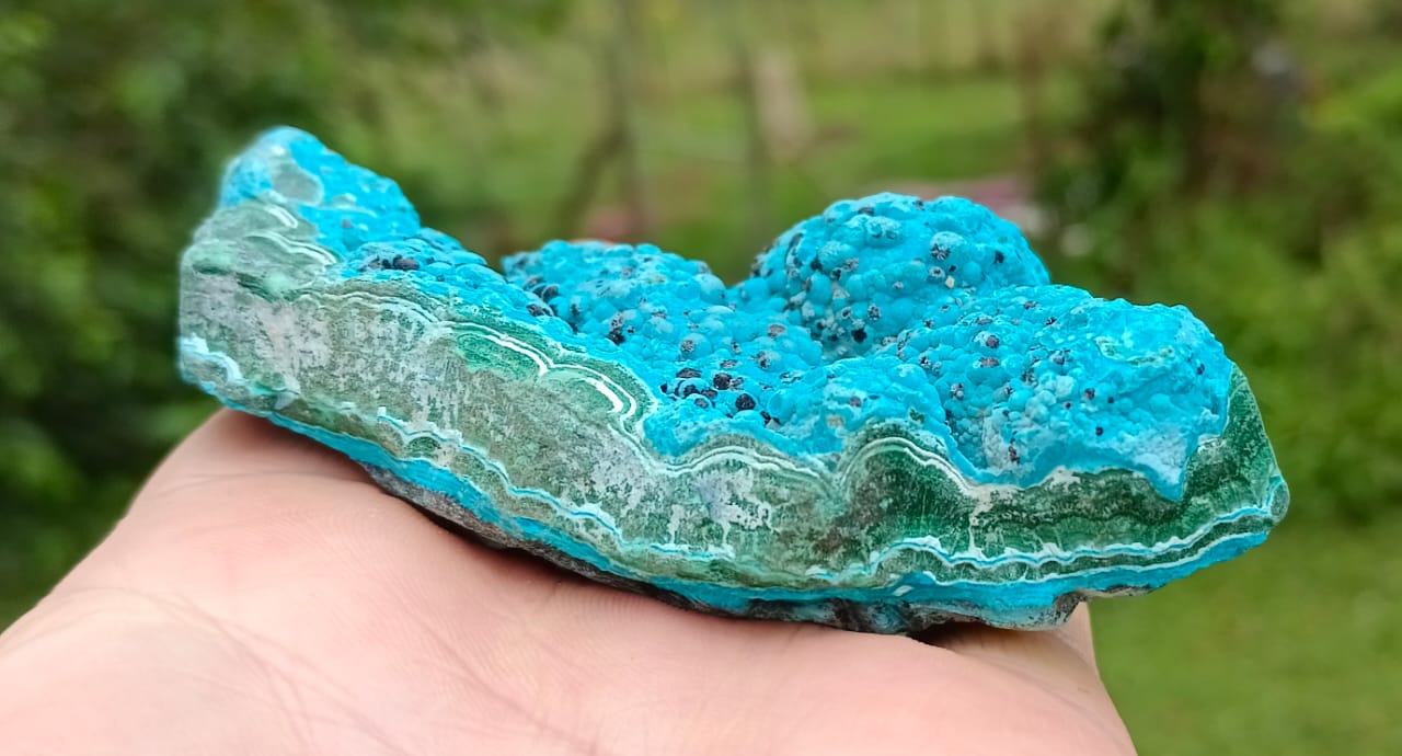This palm sized item has a pretty shape and looks like an island of blue, resting on the green waves of malachite, with interesting black inclusions, and wavy botryoidal growth.
