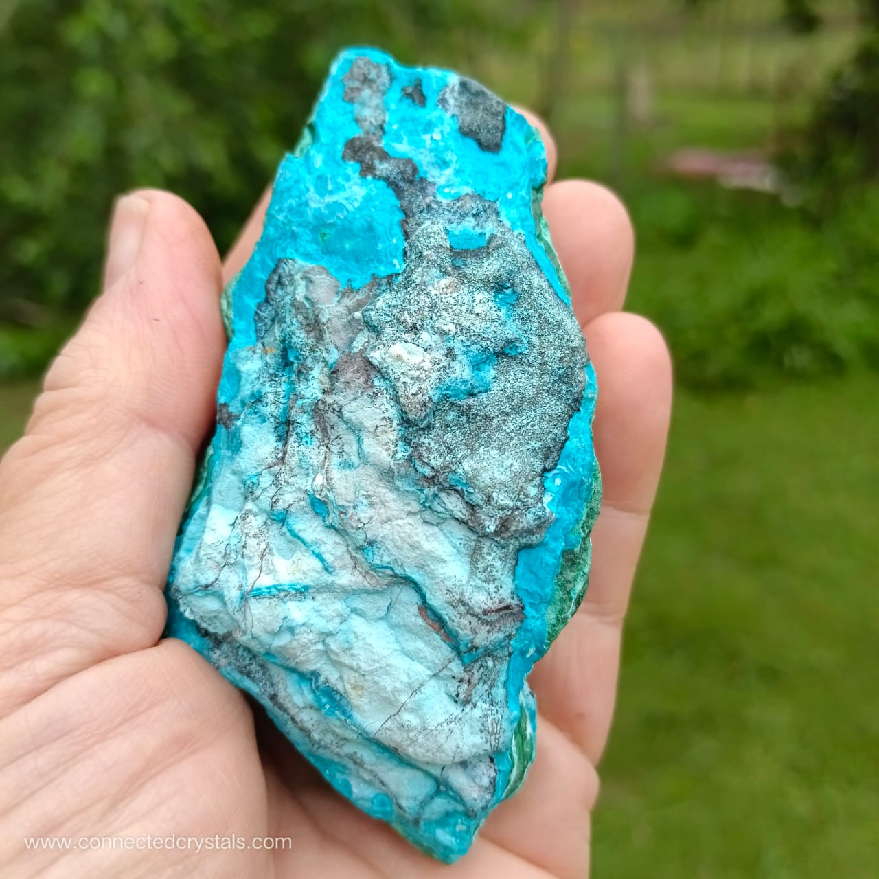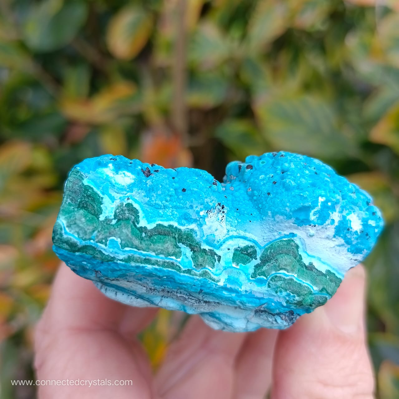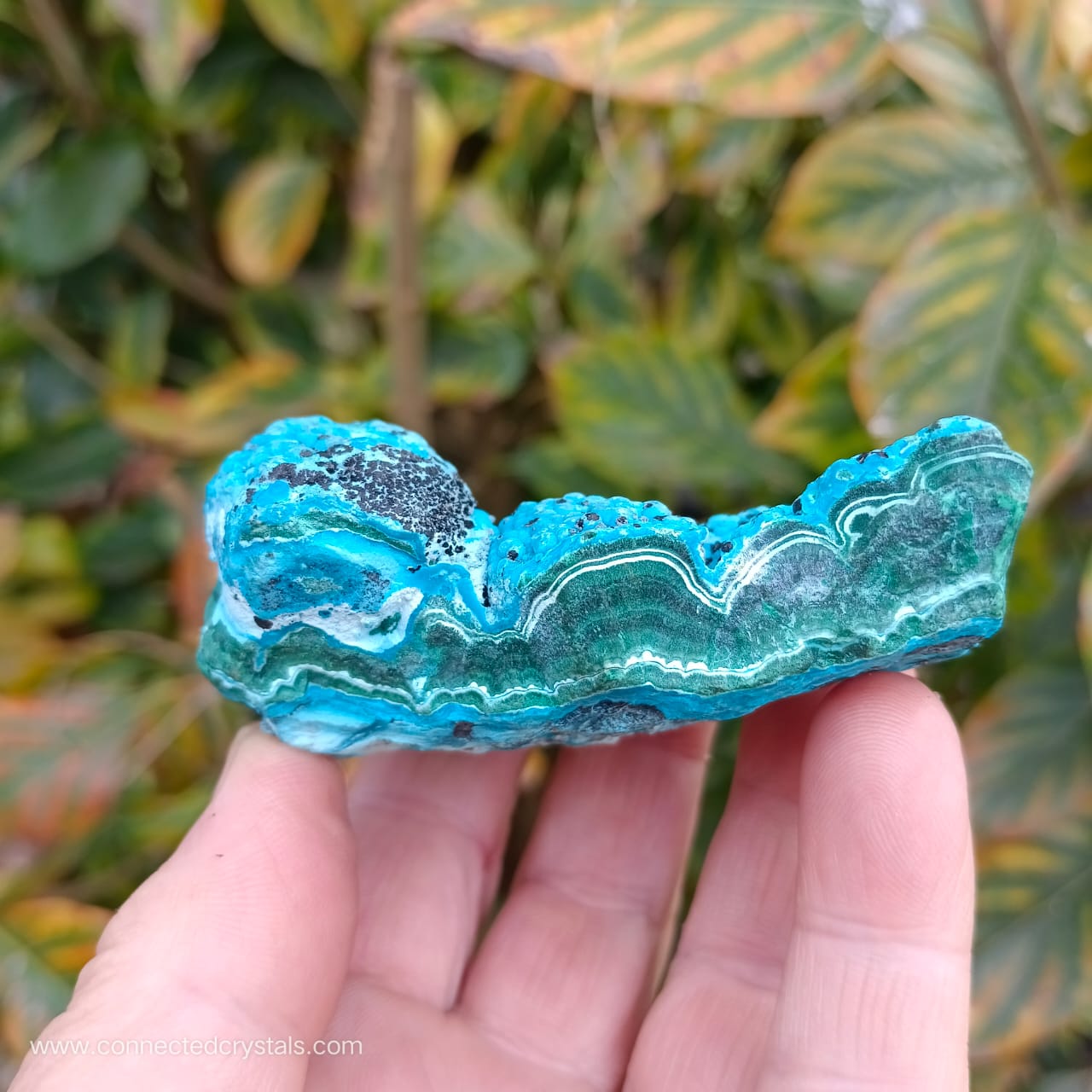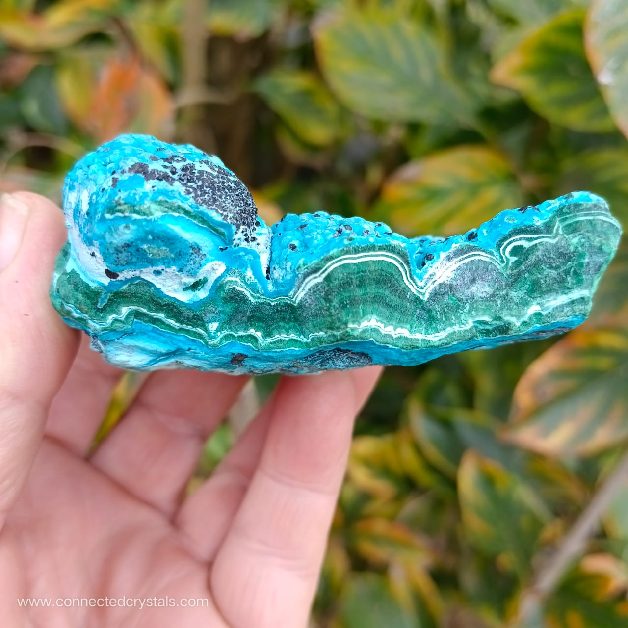 This palm sized item has a pretty shape and looks like an island of blue, resting on the green waves of malachite, with interesting black inclusions, and wavy botryoidal growth.